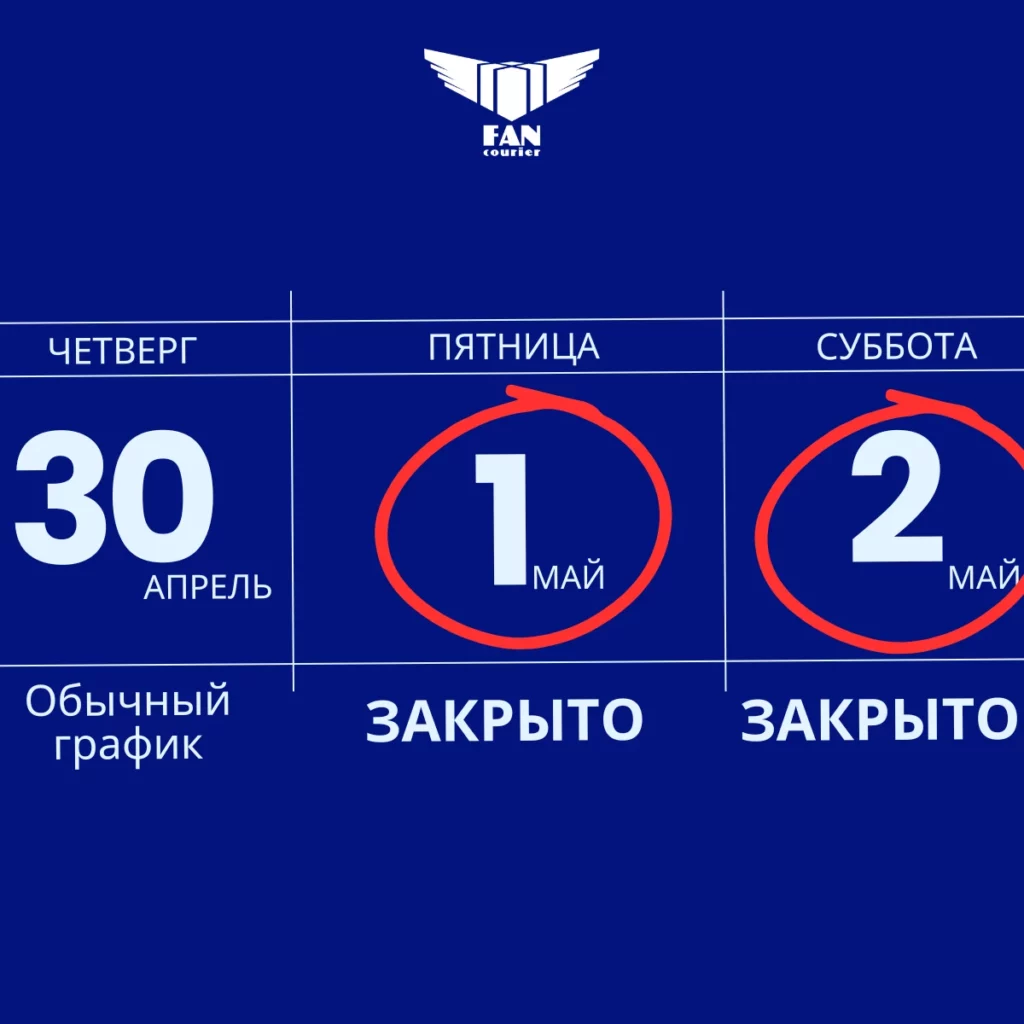 В пятницу, 1 мая, и в субботу, 2 мая, мы не осуществляем доставки и не работаем с клиентами.